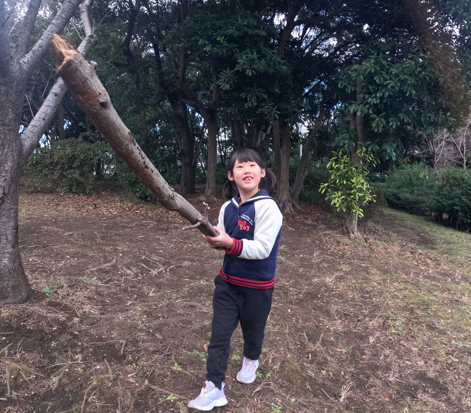 自分で枝を探して、先端にフォークを付けてレッツ!フォーキング!