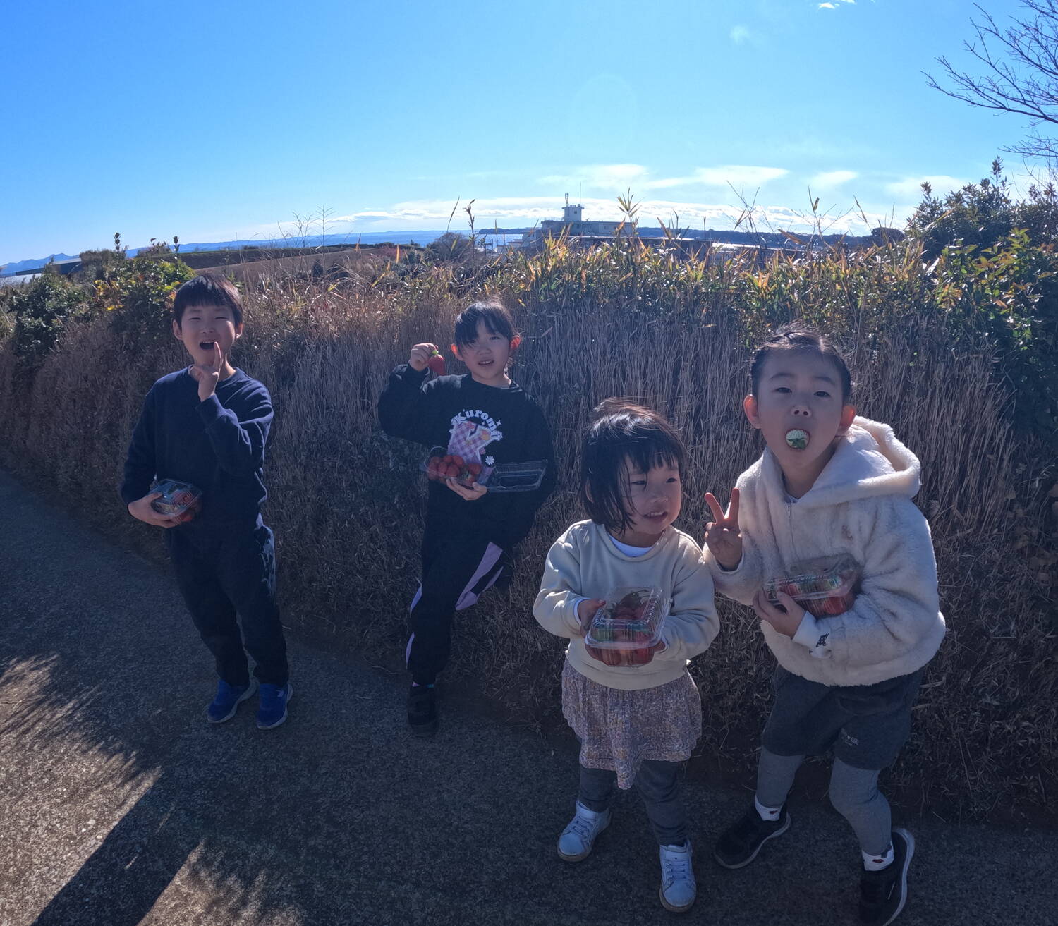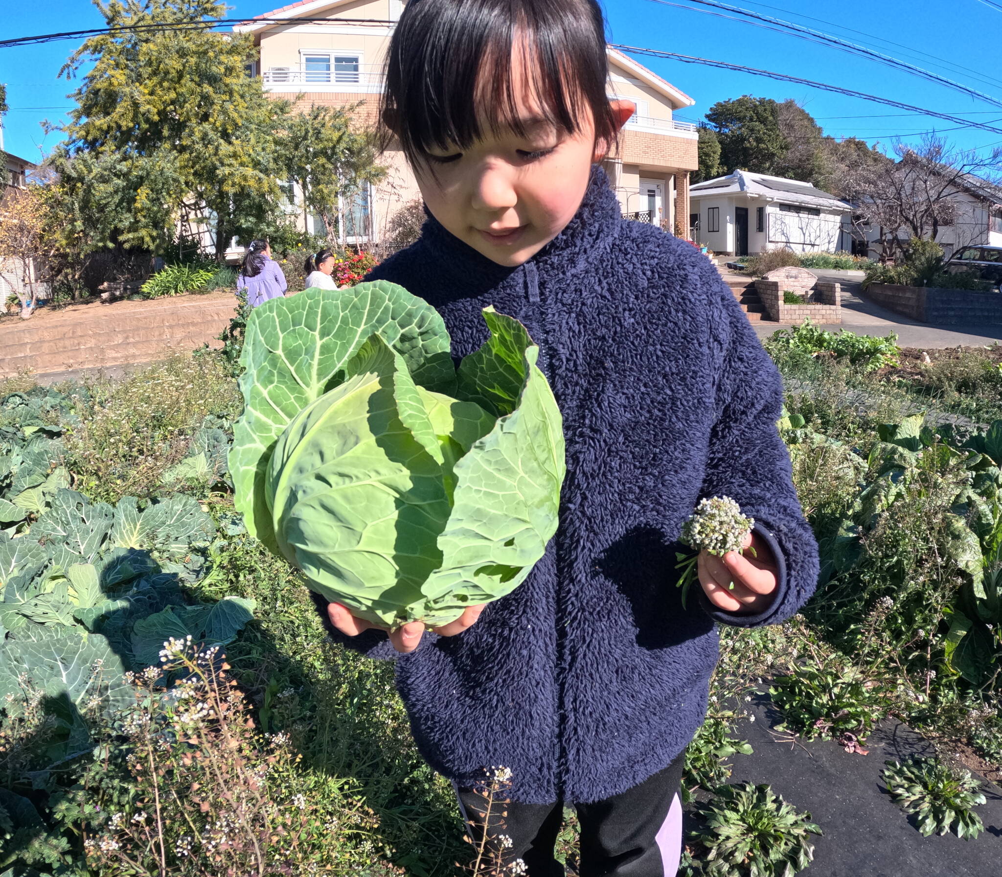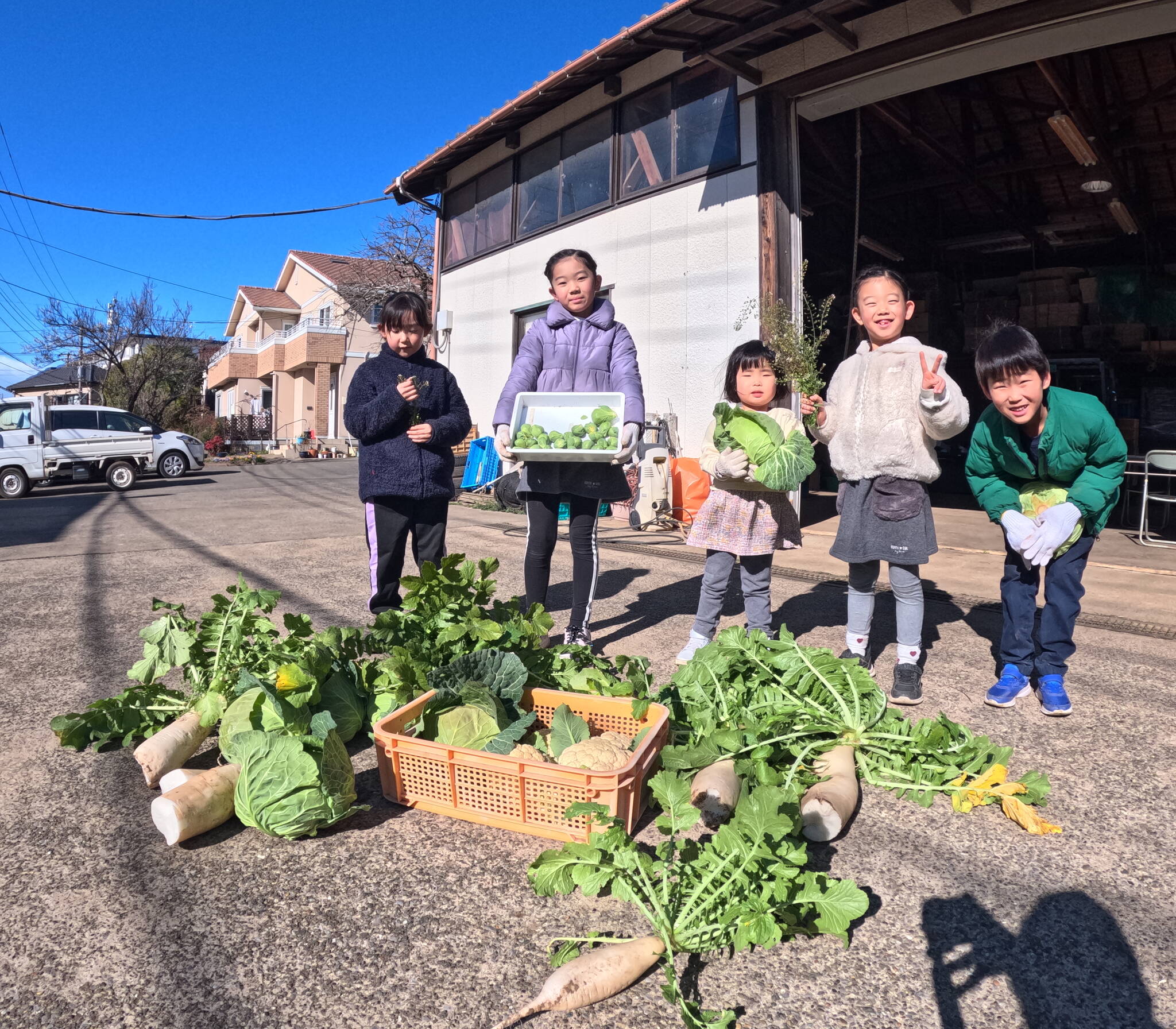 ひと遊びをしたら、お土産野菜(三浦大根・キャベツ・ブロッコリー・カリフラワー・トマト・いちご)をもってお家の人の待つ場所へ。