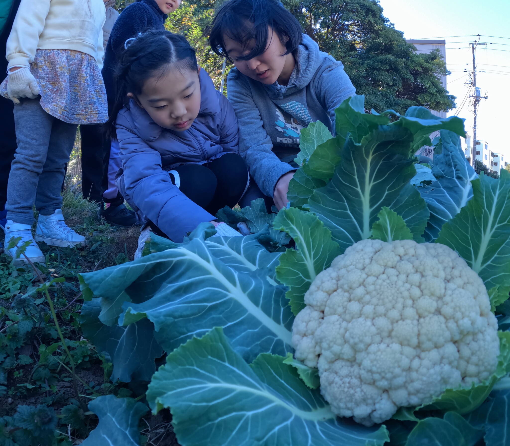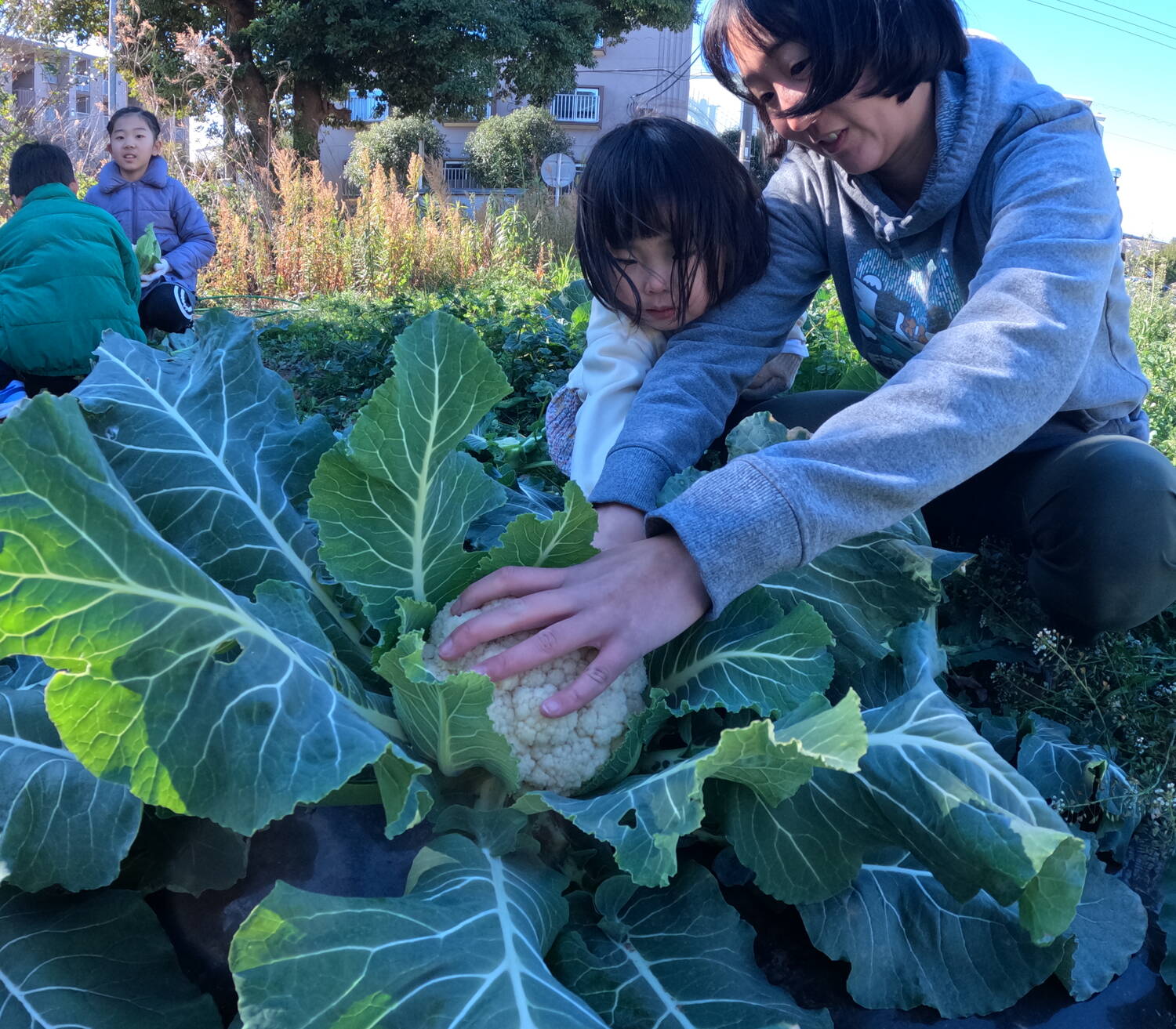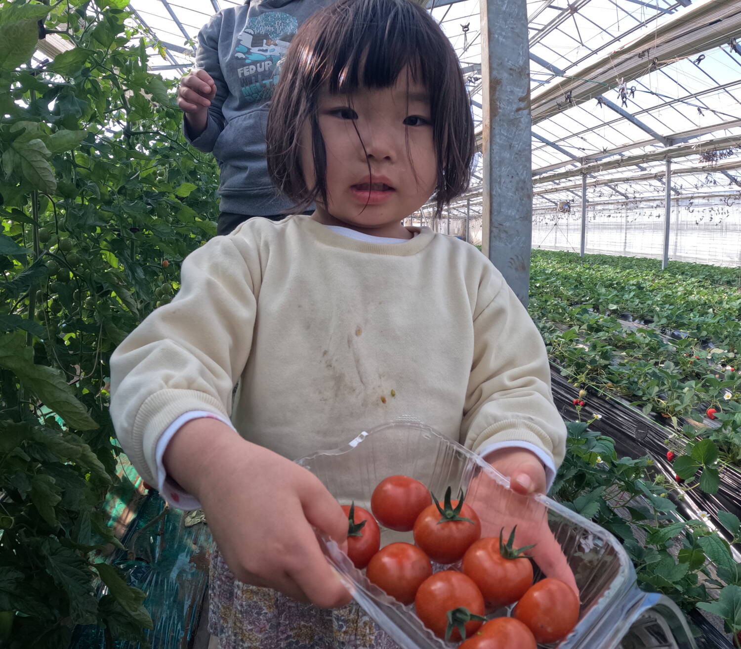 ひと遊びをしたら、お土産野菜(三浦大根・キャベツ・ブロッコリー・カリフラワー・トマト・いちご)をもってお家の人の待つ場所へ。