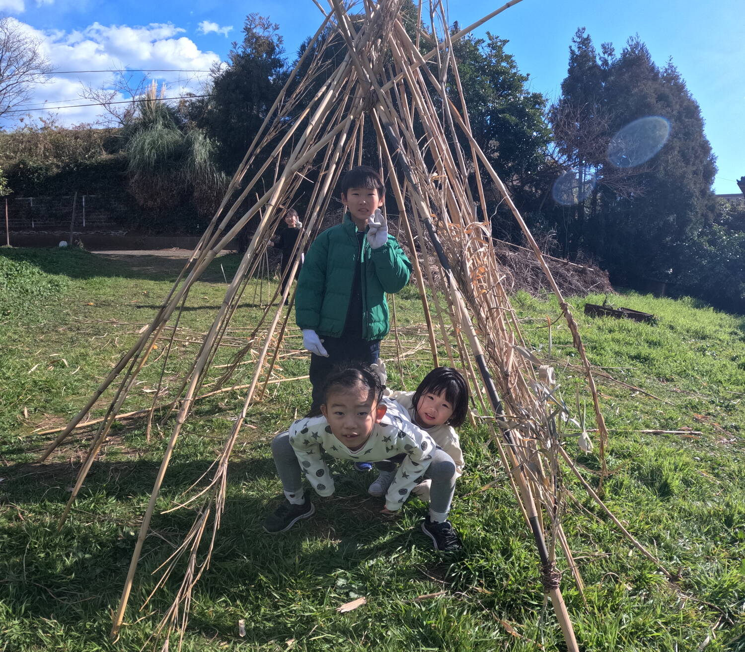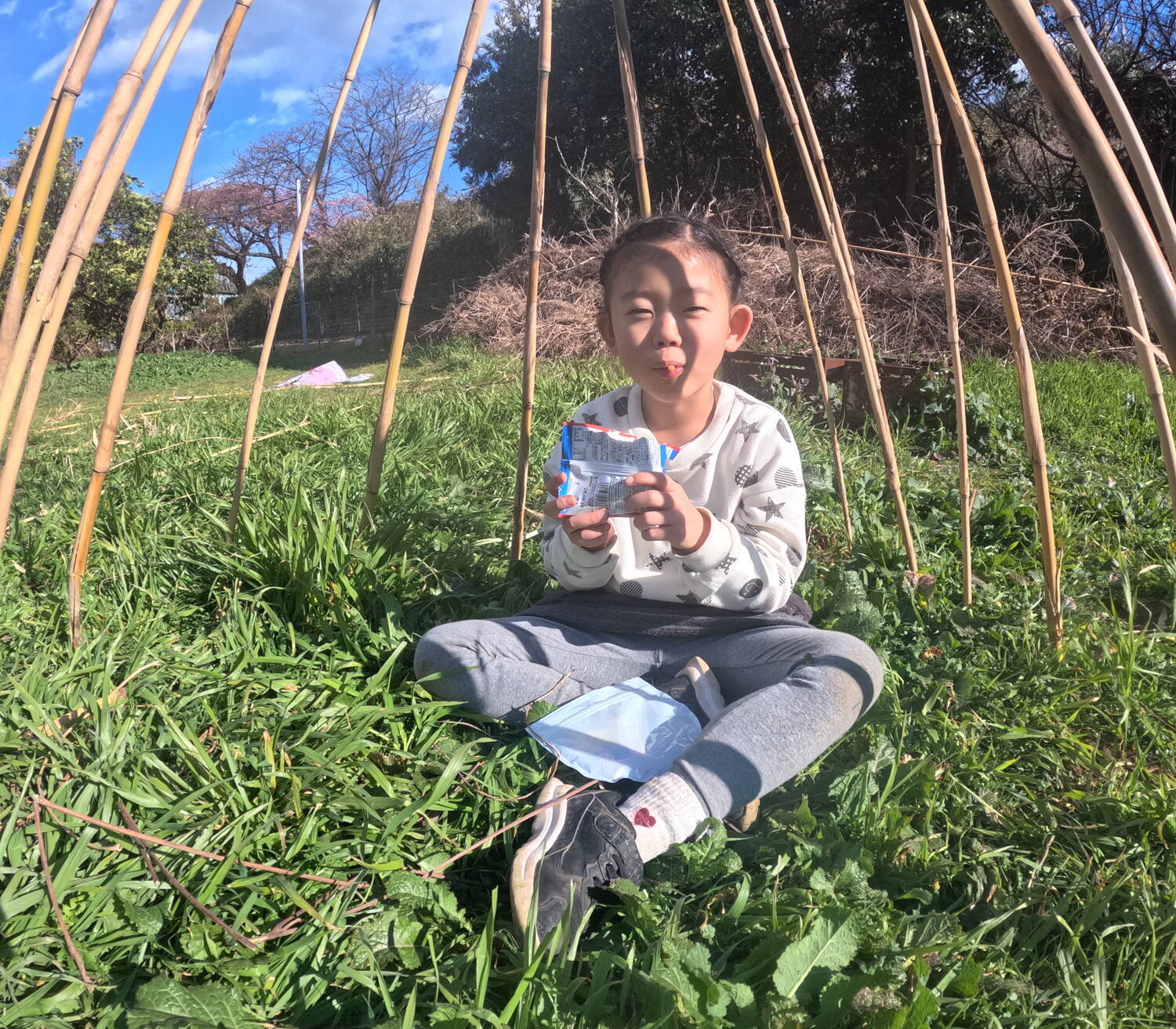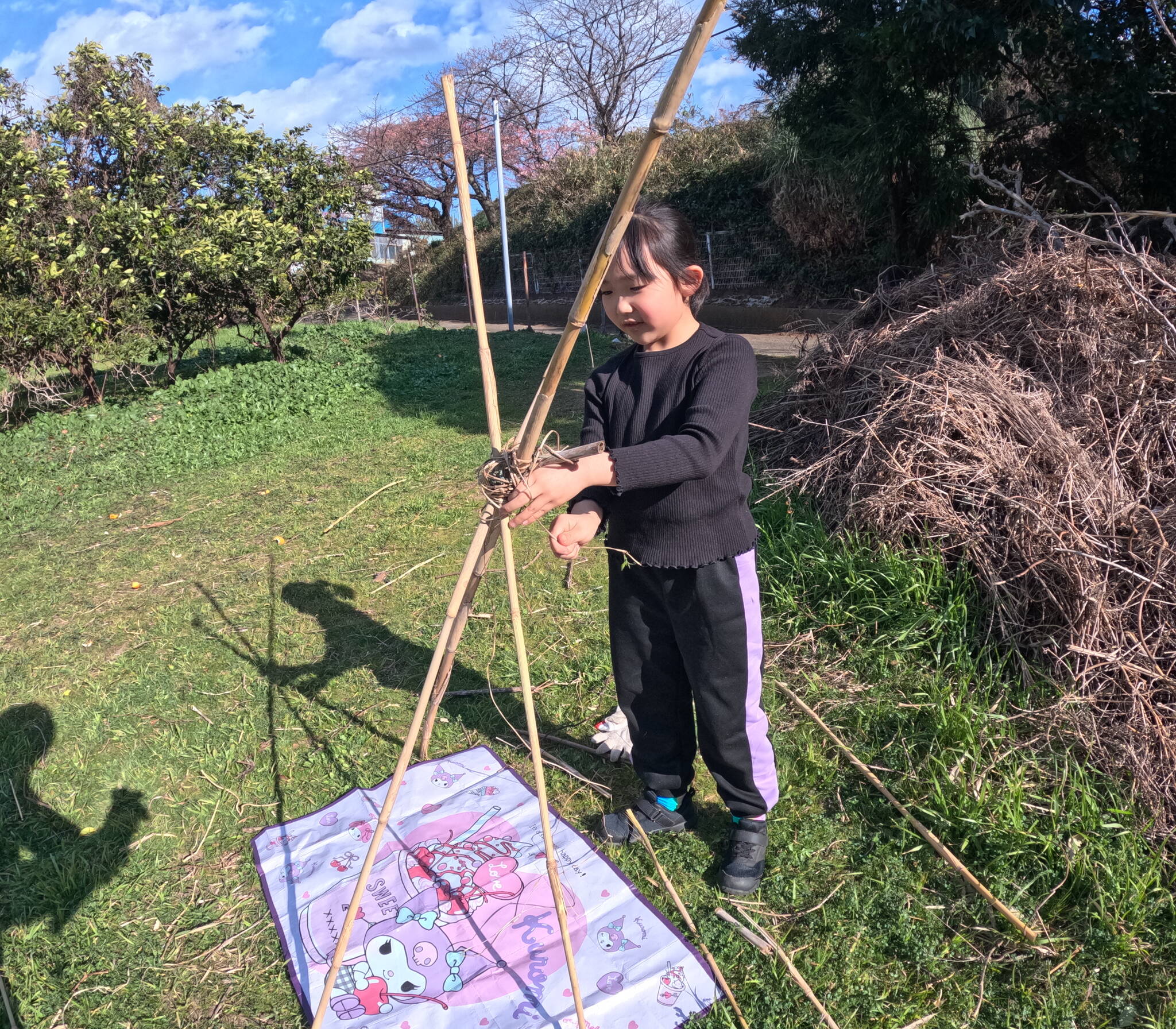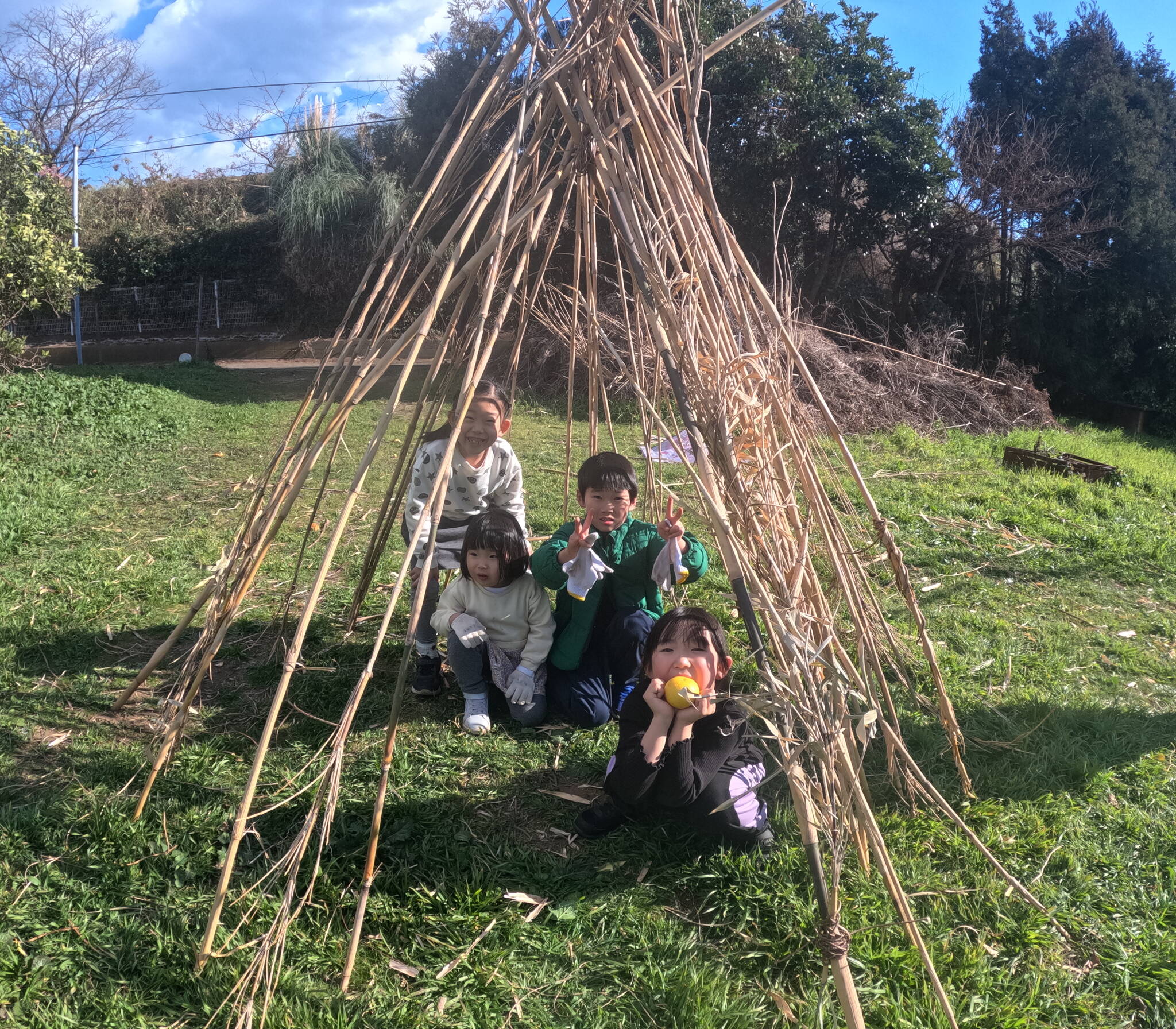 沢山食べたら、みかん畑に移動して、みんなが楽しみにしていた秘密基地づくり