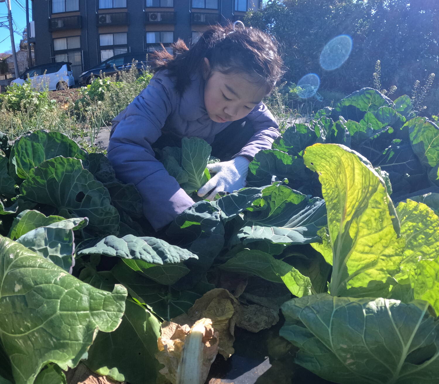 キャベツは大きくて美味しそうなのを自分で見つけて、包丁で切って収穫をします。