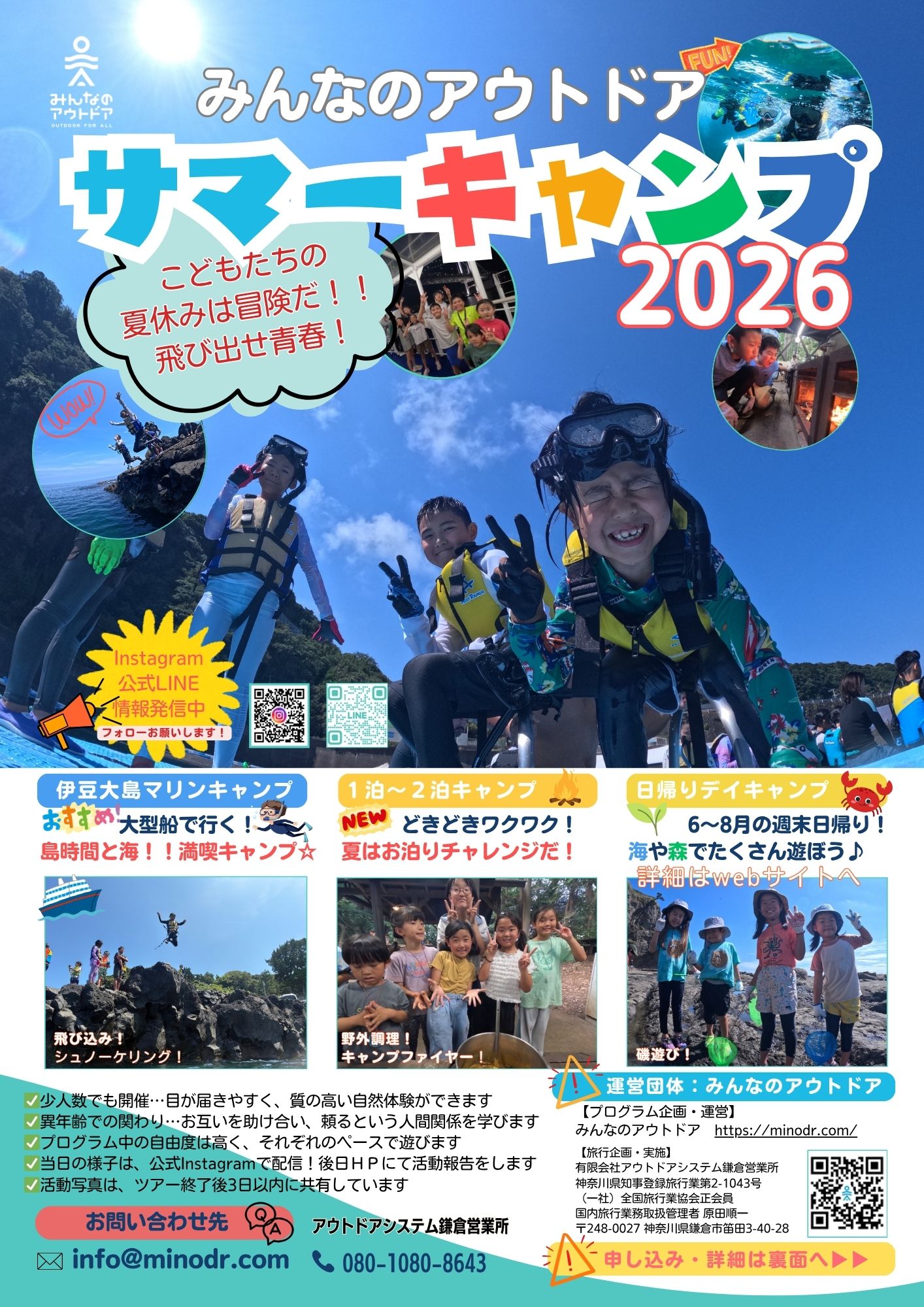 サマーキャンプの受付を開始しました!!! 一年で一番長いお休み、夏休みがやってきた!!🌊せっかくの夏休み、海や川に友達やリーダーと遊びにいこう♪どのキャンプに行きましょう!?☺さぁ、最高の夏休みを!!サマーキャンプ2026プログラム ⇦こちらをクリックしてご覧ください。