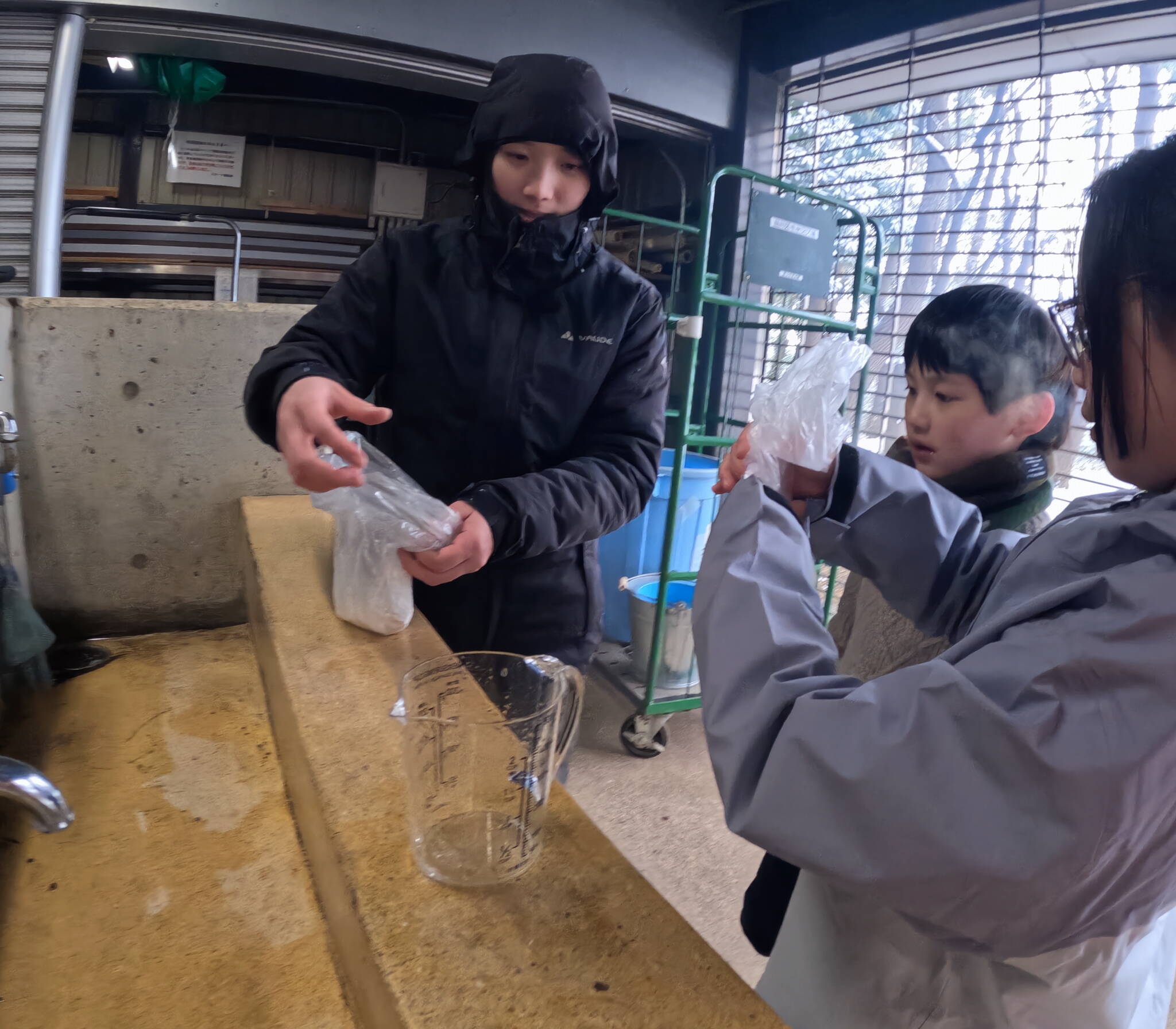 蒸しパンは、アイラップにホットケーキミックス粉とお水をいれて蒸していきます。