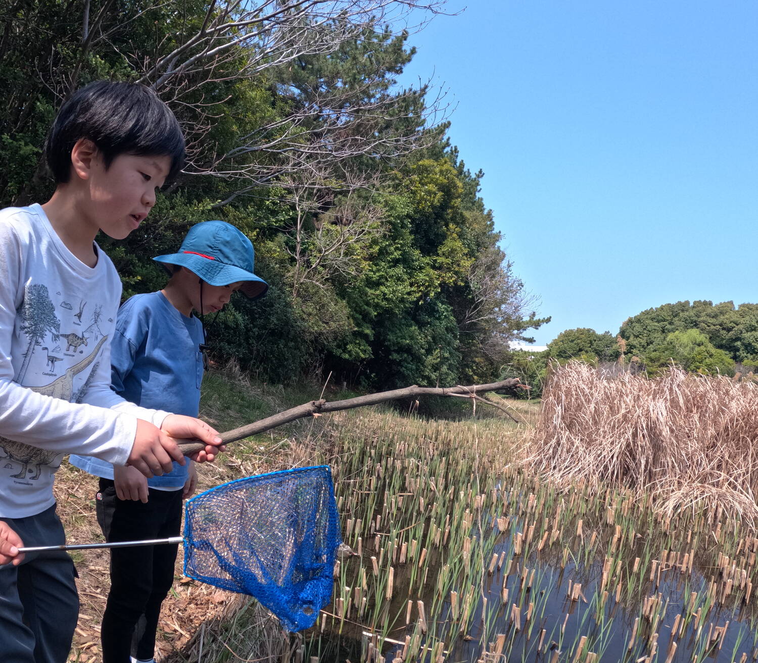 網だけではなかなか捕まえられず、ヒモと枝を使ってお手製の仕掛けに持ち替えます。