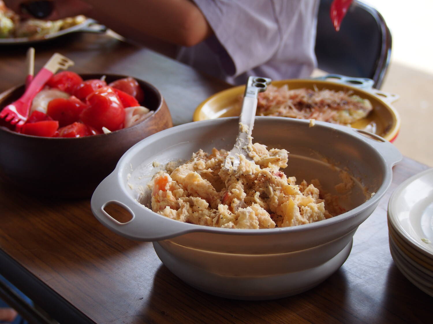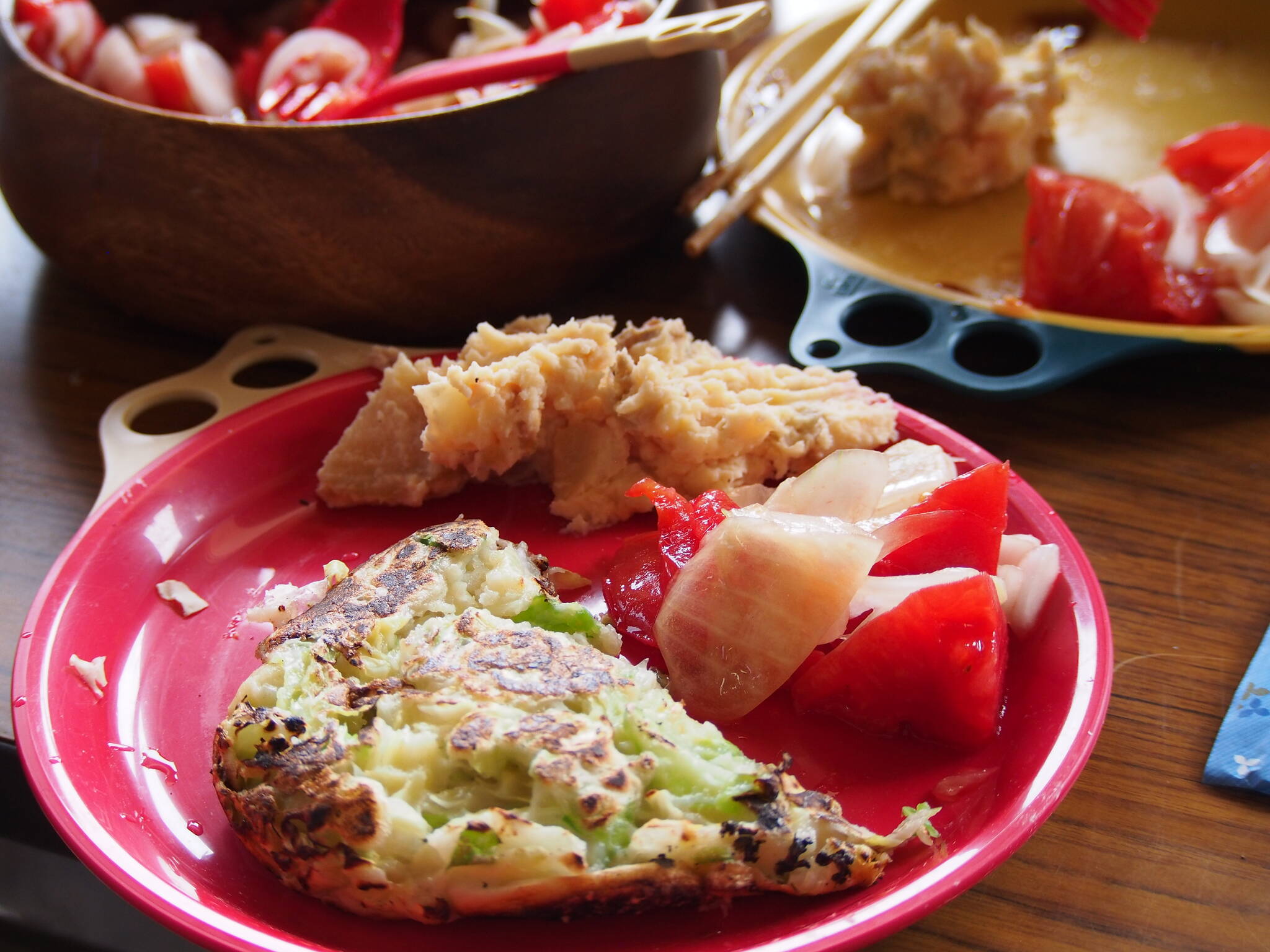 メニューは【ビーツのポテトサラダ】【新玉とトマトのポン酢サラダ】【春キャベツのお好み焼き】