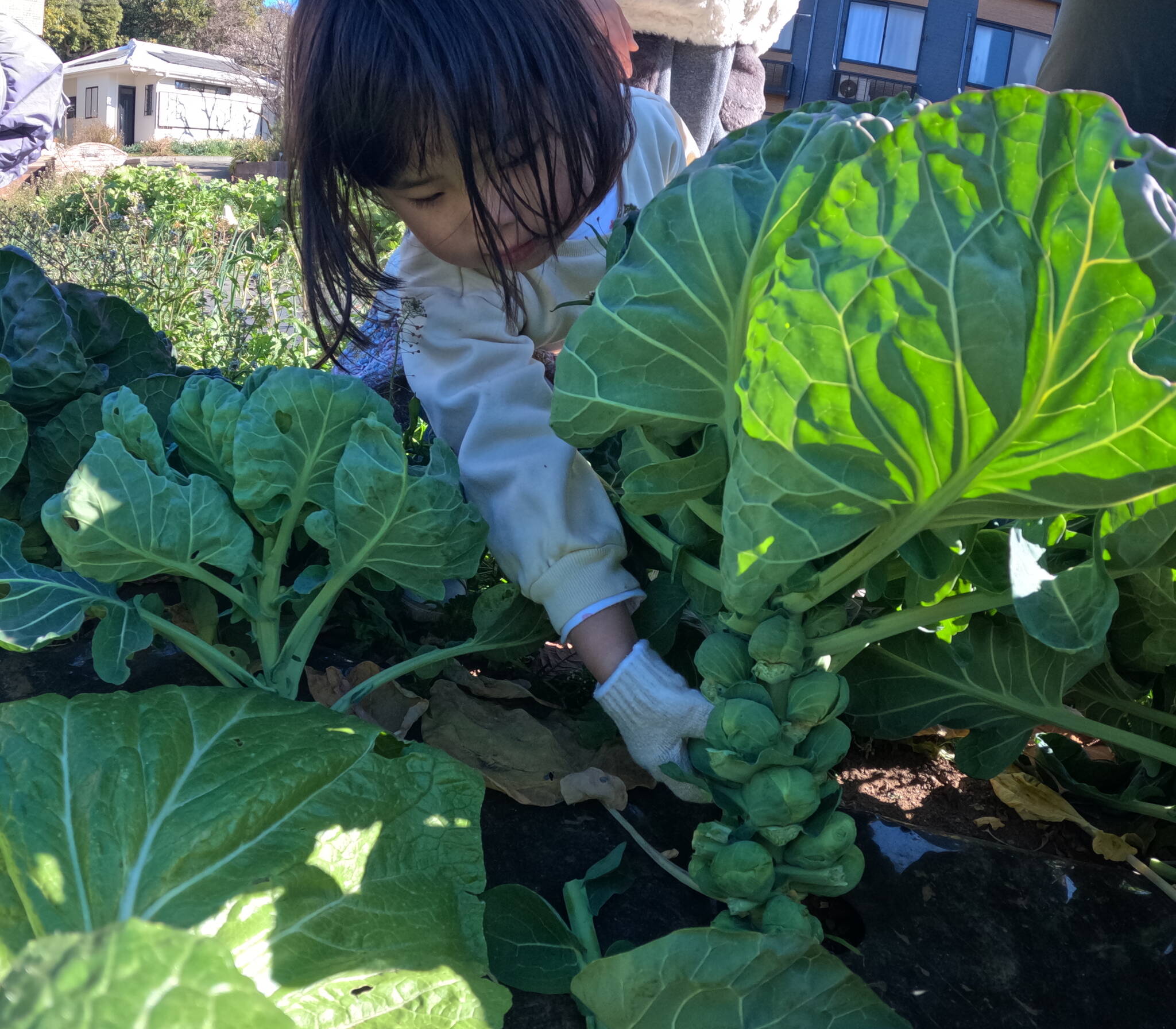 芽キャベツは、手で大きくなっているのをポキット折るように収穫。
