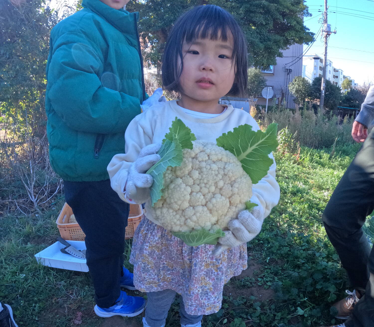 ひと遊びをしたら、お土産野菜(三浦大根・キャベツ・ブロッコリー・カリフラワー・トマト・いちご)をもってお家の人の待つ場所へ。